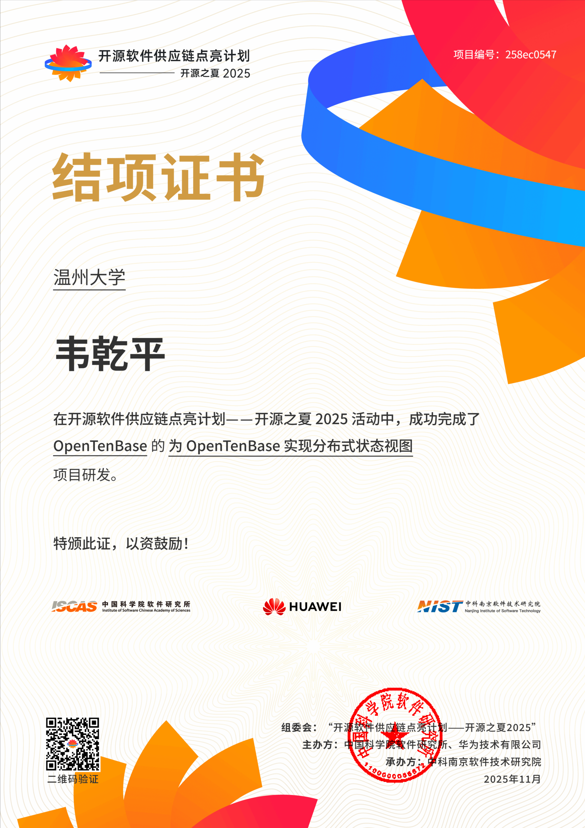 “开源之夏”是由中国科学院软件研究所、华为技术有限公司等权威机构联合发起的面向全球学生的开源软件开发计划,在高校及开源社区中享有广泛声誉。2025年,活动共吸引全球450所高校的2290名学生报名,上线项目565个。经过严格评审与为期三个月的开发实践,最终437个项目通过高标准验收并成功结项。能够在这一高水平开源孵化计划中完成开发任务,充分体现了参与者具备解决复杂工程问题的能力,其项目经历在行业内具有较高认可度。
