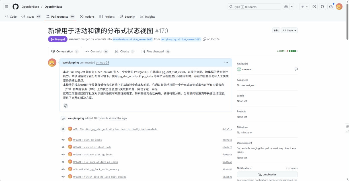为期三个月的开发周期中,他在社区导师的指导下,独立设计并实现了名为“pg_dist_stat_views”的核心扩展模块,为OpenTenBase构建了全局分布式状态监控系统。该系统解决了分布式数据库运维中的“信息孤岛”问题。运维人员无需再手动登录多个节点拼凑分析,即可获取查询在全局集群中的完整执行链路与锁依赖关系,显著提升了运维诊断效率。