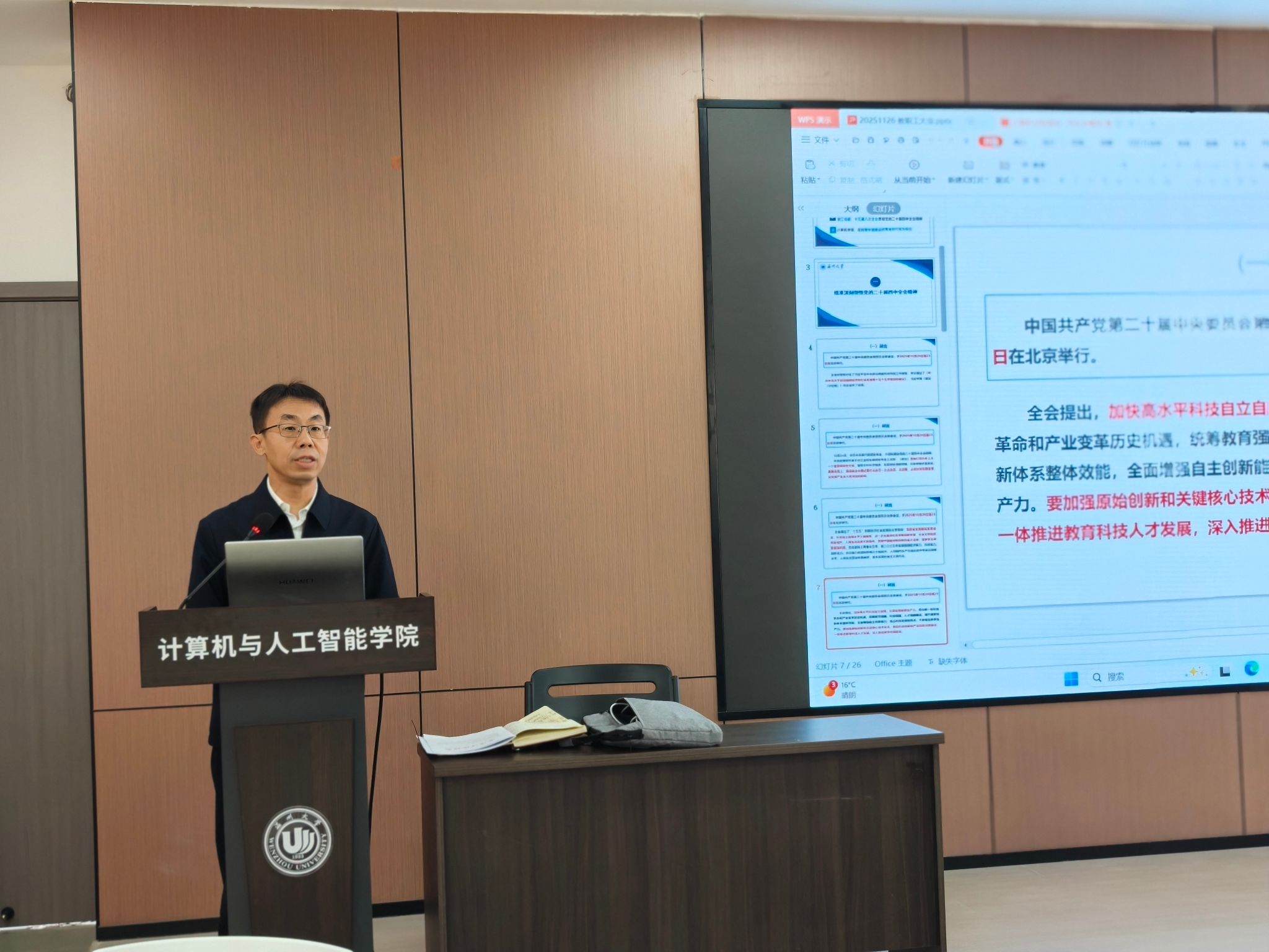 会议特邀校党委委员、组织部部长夏春雨同志作题为《精准深刻领悟党的二十届四中全会精神,在数智中国建设的黄金时代办好计算机与人工智能学院》的专题宣讲。