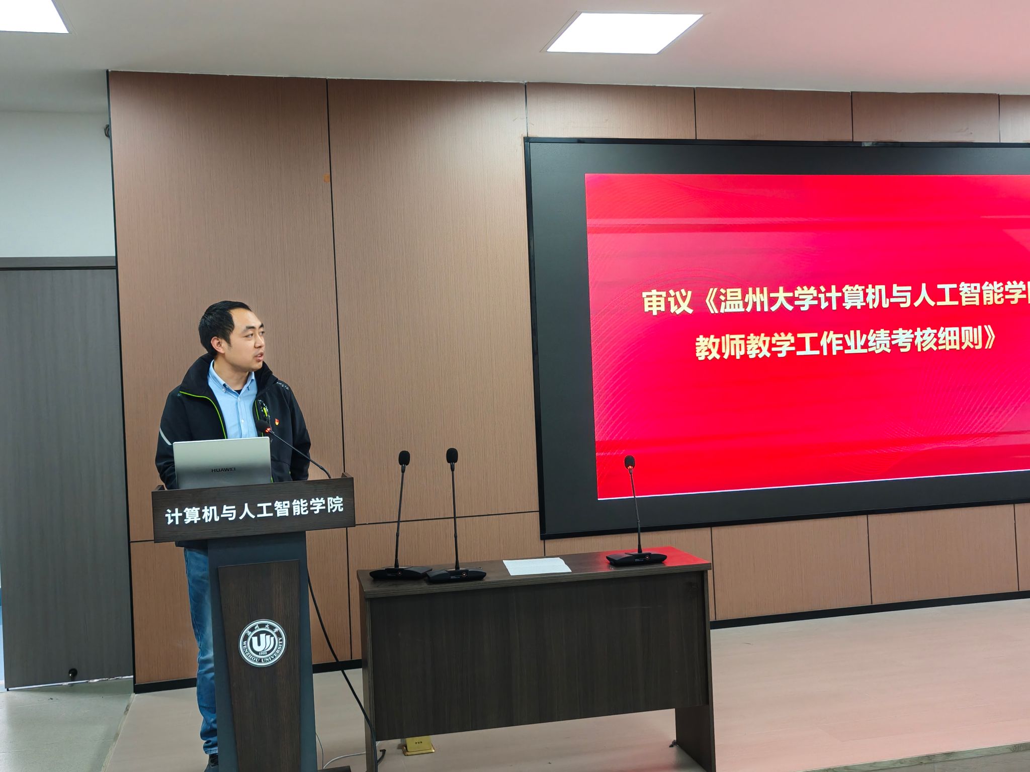 学术副院长张楠就《温州大学计算机与人工智能学院教师教学工作业绩考核细则》进行了详细解读,重点阐述了细则的修订内容与实施要点。随后,会议依照程序组织全体与会教师对该细则进行投票表决。