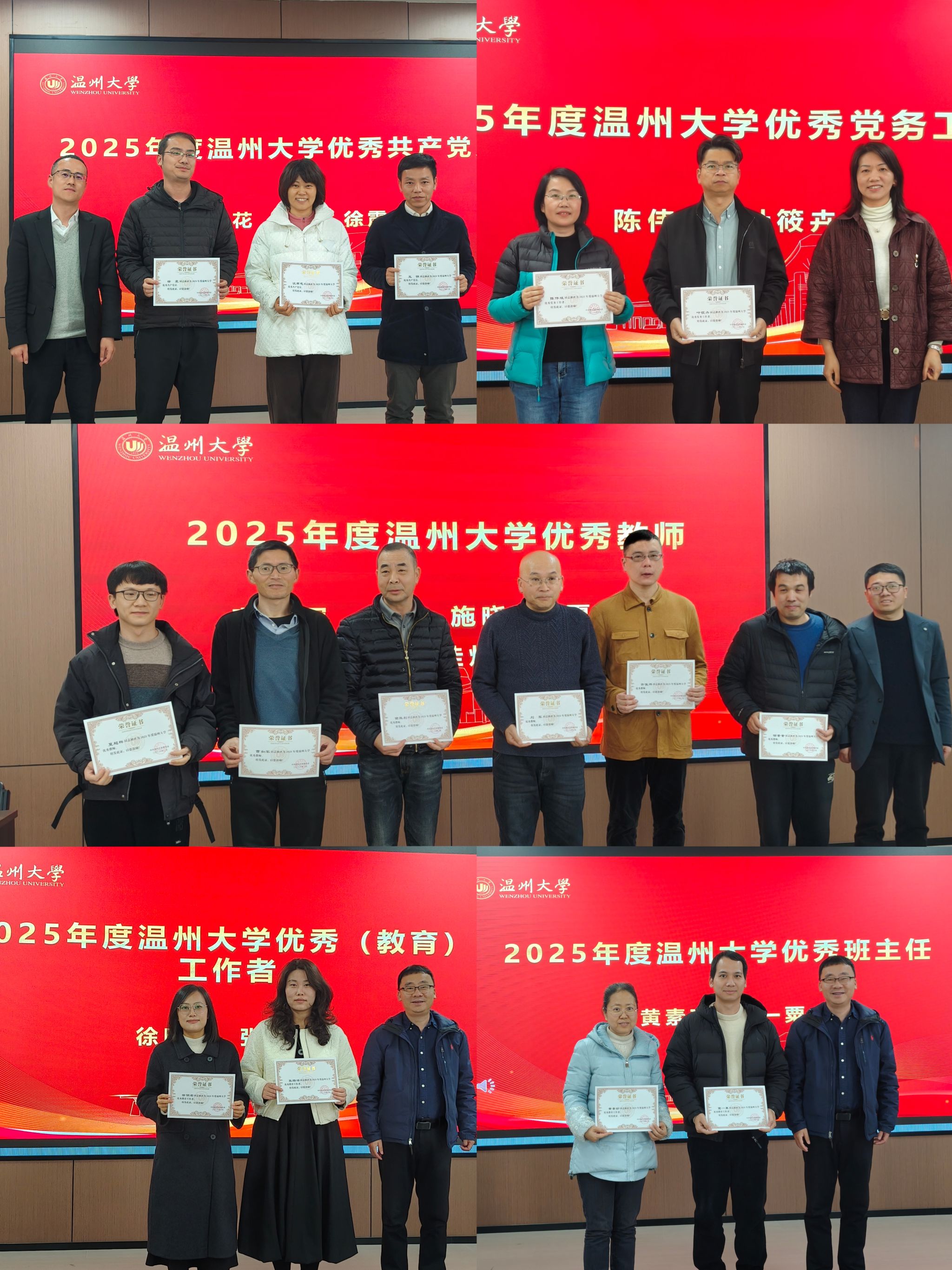 会议伊始,学院对2025年度取得的突出成绩进行了回顾。学院荣获2025年度学科性学院综合考核优秀奖,在学科性学院考核中荣获“综合考核优秀奖”,学院教师及参与团队在“校长特别奖”评选中取得佳绩,充分体现了学校对学院各项工作的肯定。随后,会议对获得2025年度温州大学优秀共产党员、优秀党务工作者、优秀教师、优秀(教育)工作者、优秀班主任荣誉称号的教师颁发了奖状,激励全体教职工以先进为榜样,立足岗位、再创佳绩。