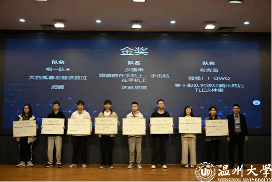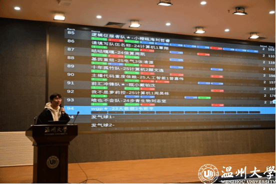 颁奖典礼现场,温州大学教务处副处长吴志敏、计算机学院书记全力、计算机学院副院长赵汉理、校ACM竞赛主教练胡明晓以及温州小橙科技培训有限公司总经理单伟等嘉宾莅临。活动依次开展领导致辞、企业嘉宾分享环节,由ICPC亚洲区域赛金牌得主陈宇锋主持滚榜,嘉宾们为获奖队伍颁发荣誉证书,也为友情参赛队伍颁发等效证书。