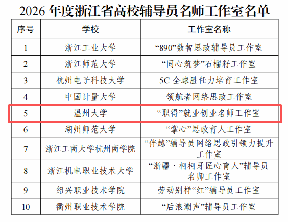 近日,浙江省教育厅公布 2026 年度省高校思想政治工作质量提升综合改革与精品建设项目立项名单公布,我校“职得”就业创业名师工作室获评2026年度浙江省高校辅导员名师工作室。