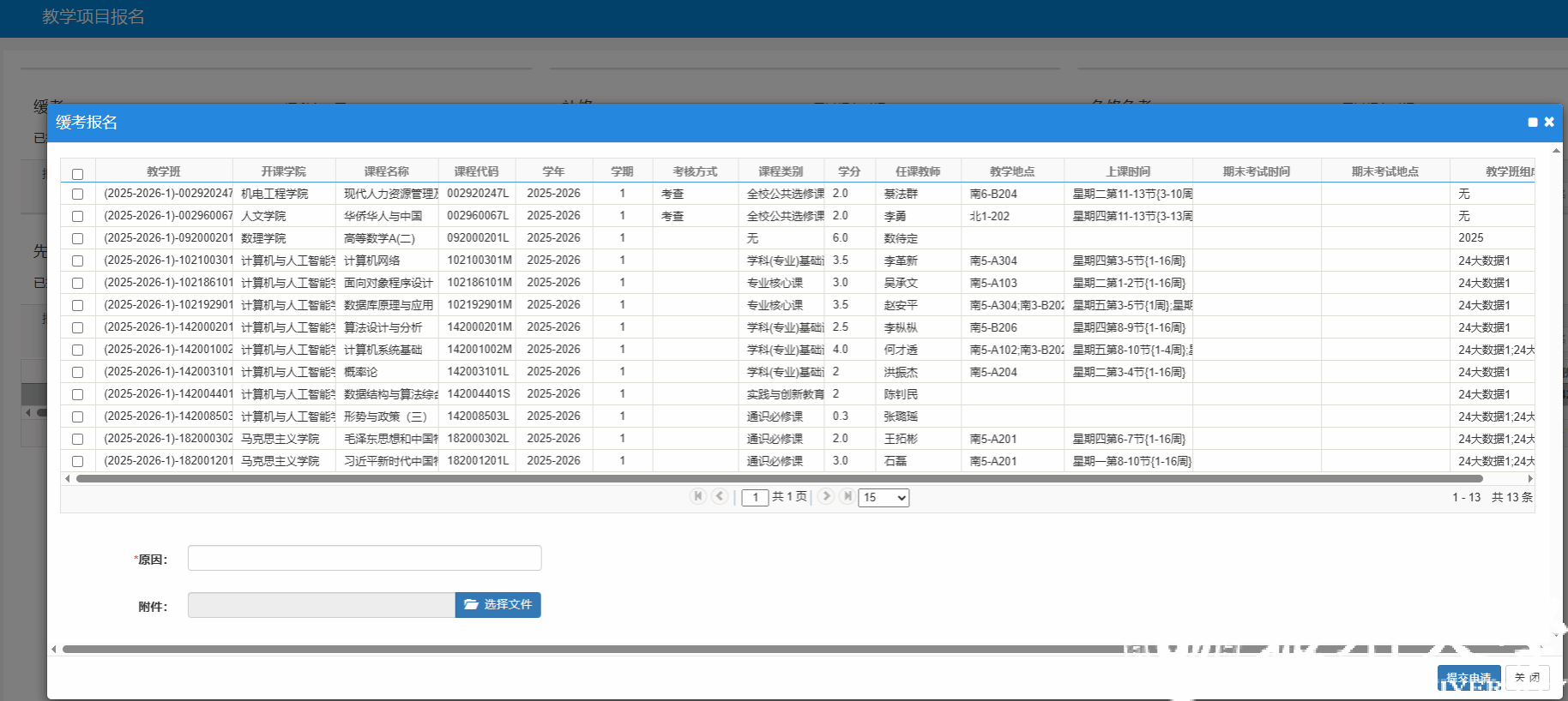 操作说明:点击页面上的“报名”按钮,在打开的子页面勾选申请缓考的的课程,填写申请原因,务必上传相应附件(如医院证明等)后,提交申请,并自行联系任课老师审核。