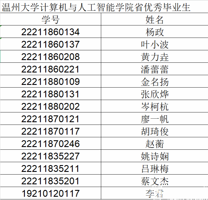 根据《温州大学优秀毕业生评选办法》(温大行政发【2020】104号)、《温州大学2026届本专科生优秀毕业生预评工作通知》,经个人申报、学院审核,学生破格申请,现对最终评选结果进行公布。