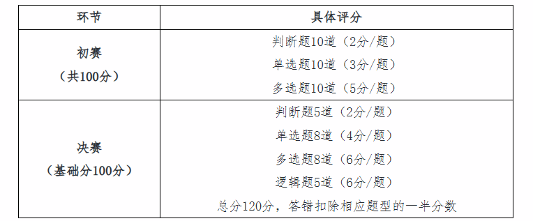 初赛阶段:采用线上知识竞答形式开展,题型包含判断题、单选题及多选题,满分100分。若出现同分情况,以答题时间长短排序,答题时间越短,名次越靠前,并依据此规则筛选出前12名晋级决赛。
