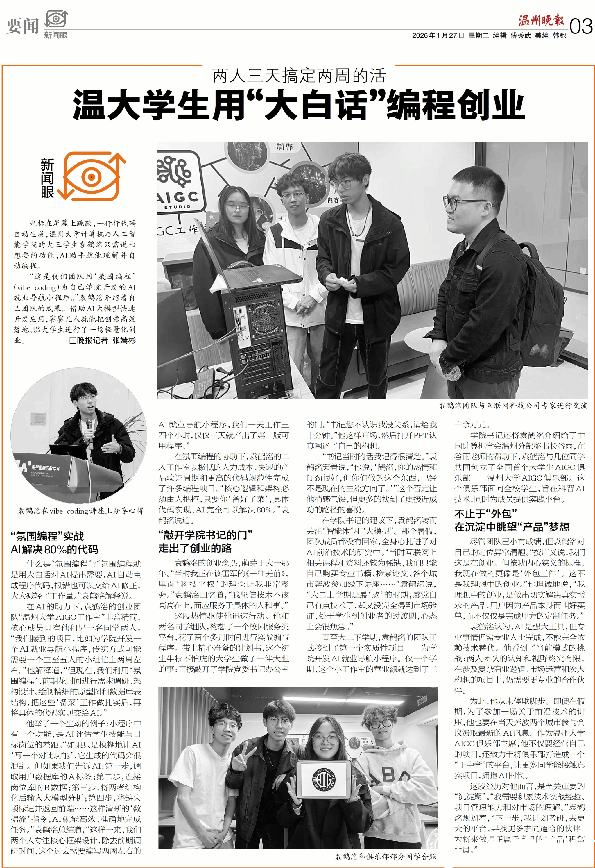 “这是我们团队用‘氛围编程’(vibe coding)为自己学院开发的AI就业导航小程序。”袁鹤洺介绍着自己团队的成果。借助AI大模型快速开发应用,寥寥几人就能把创意高效落地,温大学生进行了一场轻量化创业。□晚报记者 张嫣彬