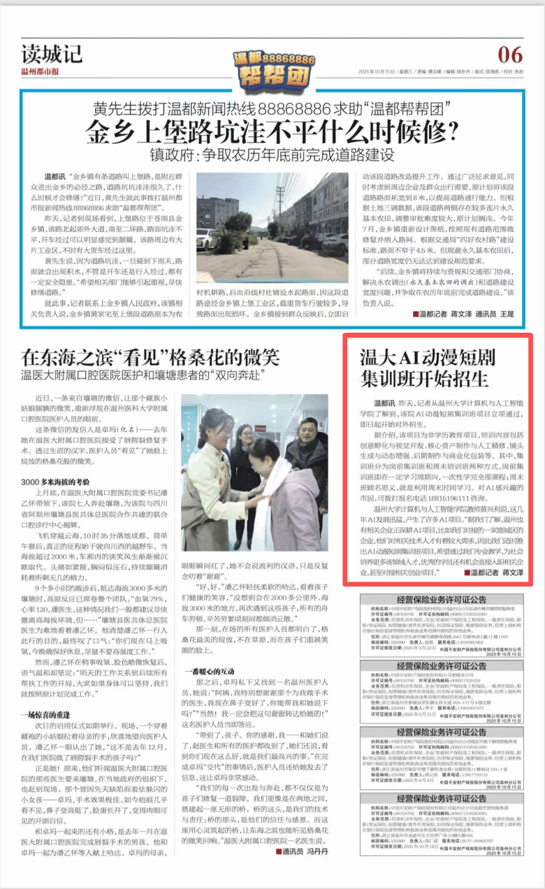 10月14日,记者从温州大学计算机与人工智能学院了解到,该院AI动漫短剧集训班项目立项通过,即日起开始对外招生。据介绍,该项目为非学历教育项目,培训内容包括创意孵化与视觉开发、核心资产制作与人工精修、镜头生成与动态增强、后期制作与商业化包装等。其中,集训班分为岗前集训班和周末培训班两种方式,岗前集训班即在一定学习周期内,一次性学完全部课程;周末班顾名思义,就是利用周末时间学习。对AI感兴趣的市民,可拨打报名电话18815196111咨询。...